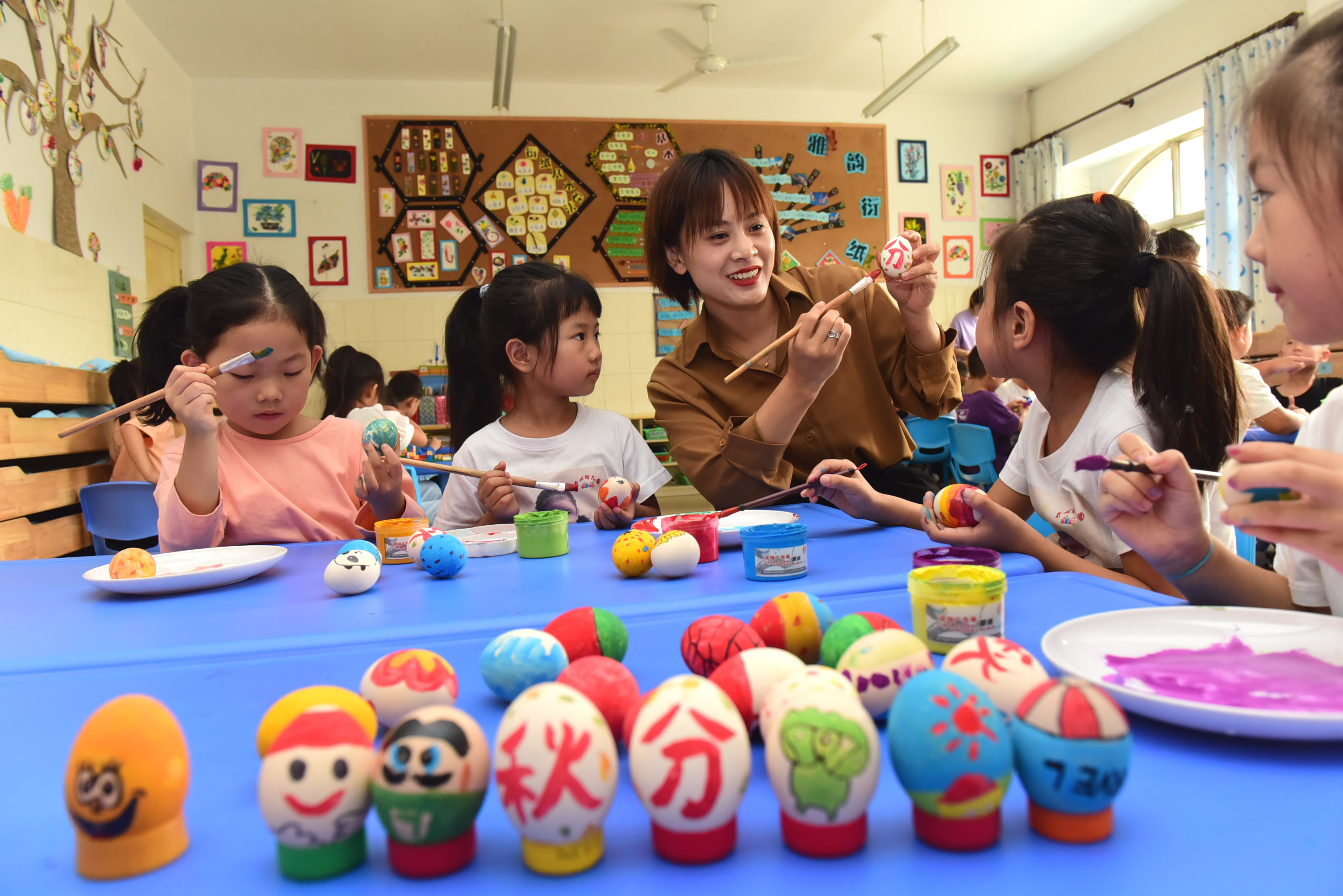 9月22日是二十四節(jié)氣中的秋分,我國有在秋分時(shí)節(jié)吃秋菜、玩豎蛋等食俗。玩“豎蛋”,是嘗試將雞蛋豎立在平滑桌面的游戲。做完游戲之后,再將其食用完畢,借此祈求身強(qiáng)力壯。圖為9月21日,河北省石家莊新樂市直幼兒園的小朋友在玩“豎蛋”游戲。賈敏杰 攝